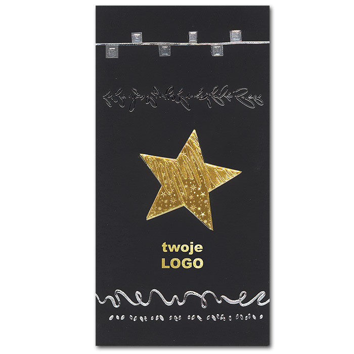 Nowoczesna i elegancka kartka świąteczna w formacie pionowym, wykonana z wysokiej jakości papieru barwionego w masie w kolorze czarnym. Na okładce znajduje się złocona gwiazda wykonana techniką hotstampingu oraz srebrne elementy graficzne, które nadają kartce wyjątkowego, świątecznego charakteru. Miejsce na logo umożliwia personalizację.