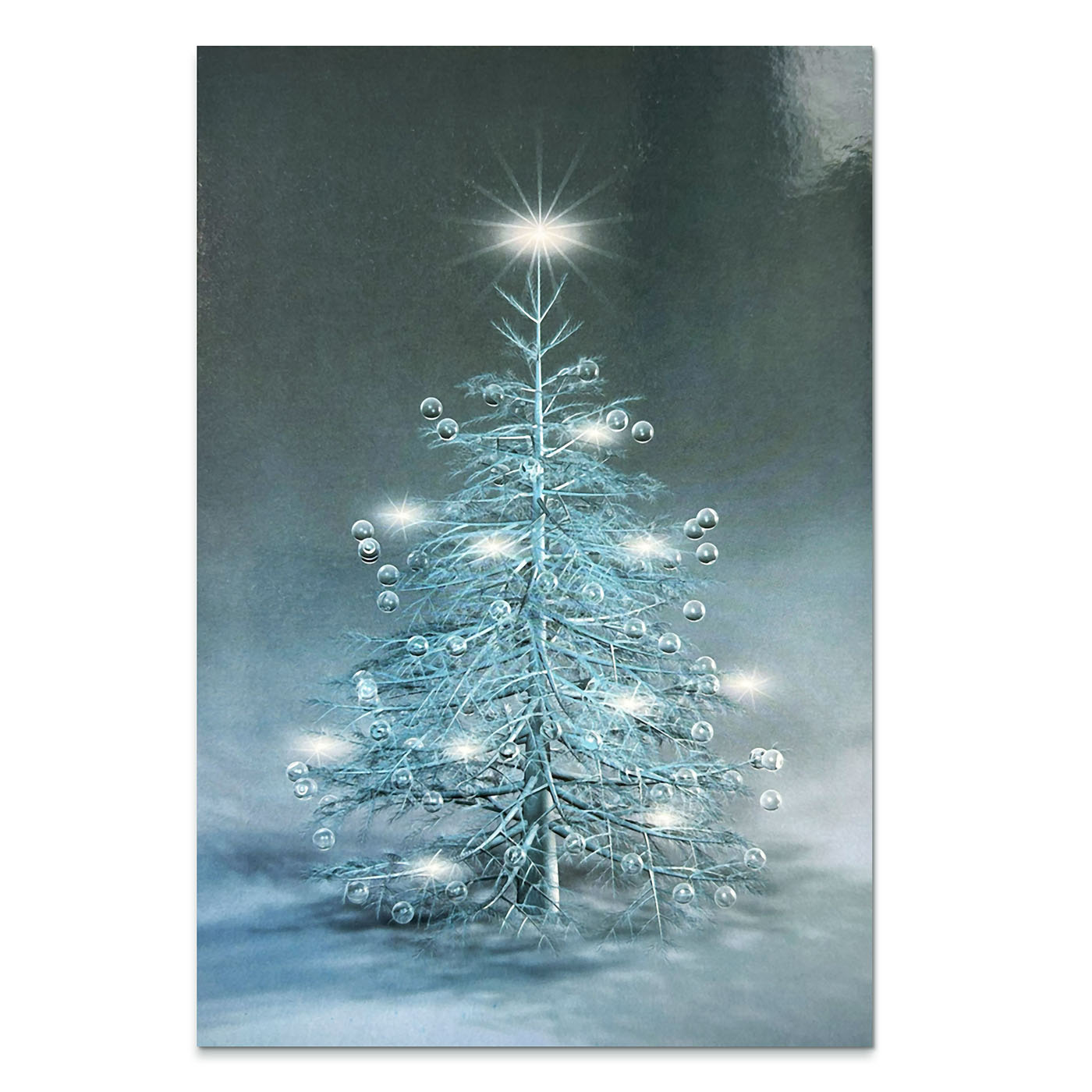 Elegancka kartka świąteczna przedstawiająca zimową, szklisto-błękitną choinkę rozświetloną subtelnym światłem. Nastrojowa, niemal fotograficzna grafika wykonana została z ogromną precyzją przy użyciu wysokiej klasy druku offsetowego na powlekanym papierze. Efekt lśniącego szronu i delikatnych bombek nadaje kartce wyjątkowego, magicznego charakteru.