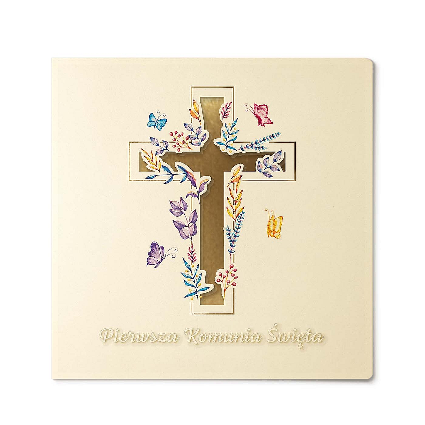 Wyjątkowe zaproszenie komunijne, wykonane z wysokiej jakości metalizowanego papieru w eleganckim odcieniu ecru. Idealne dla tych, którzy cenią subtelność, klasykę i wyrafinowane detale.