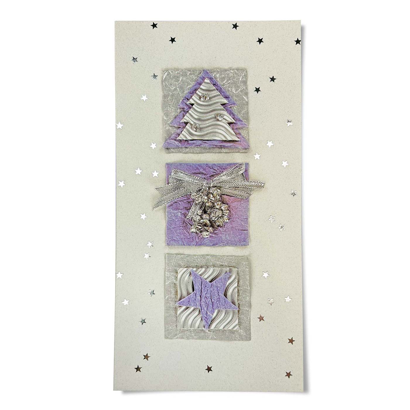 Karta świąteczna o unikalnej formie pionowej, wykonana z wysokiej jakości papieru ozdobnego w tonacji jasnego ecru. Na okładce umieszczono trójdzielną kompozycję z dekoracyjnymi aplikacjami: choinką, wiązką dzwonków i gwiazdą. Uroku dodają srebrne gwiazdki rozmieszczone na całej powierzchni karty, tworzące efekt trójwymiarowy i subtelnego blasku.