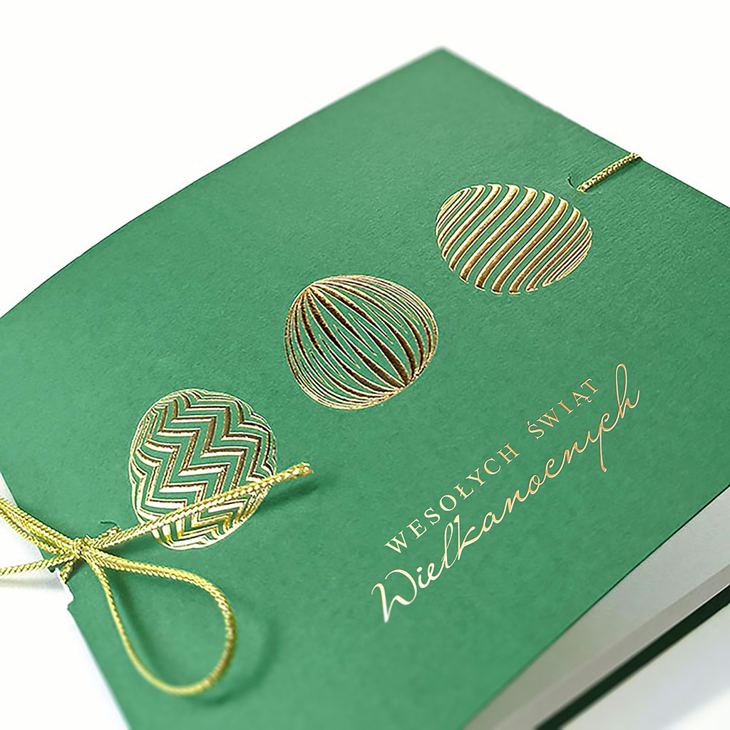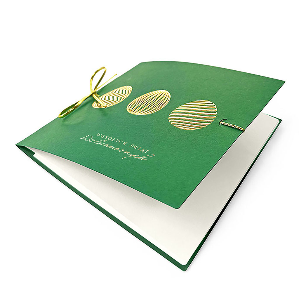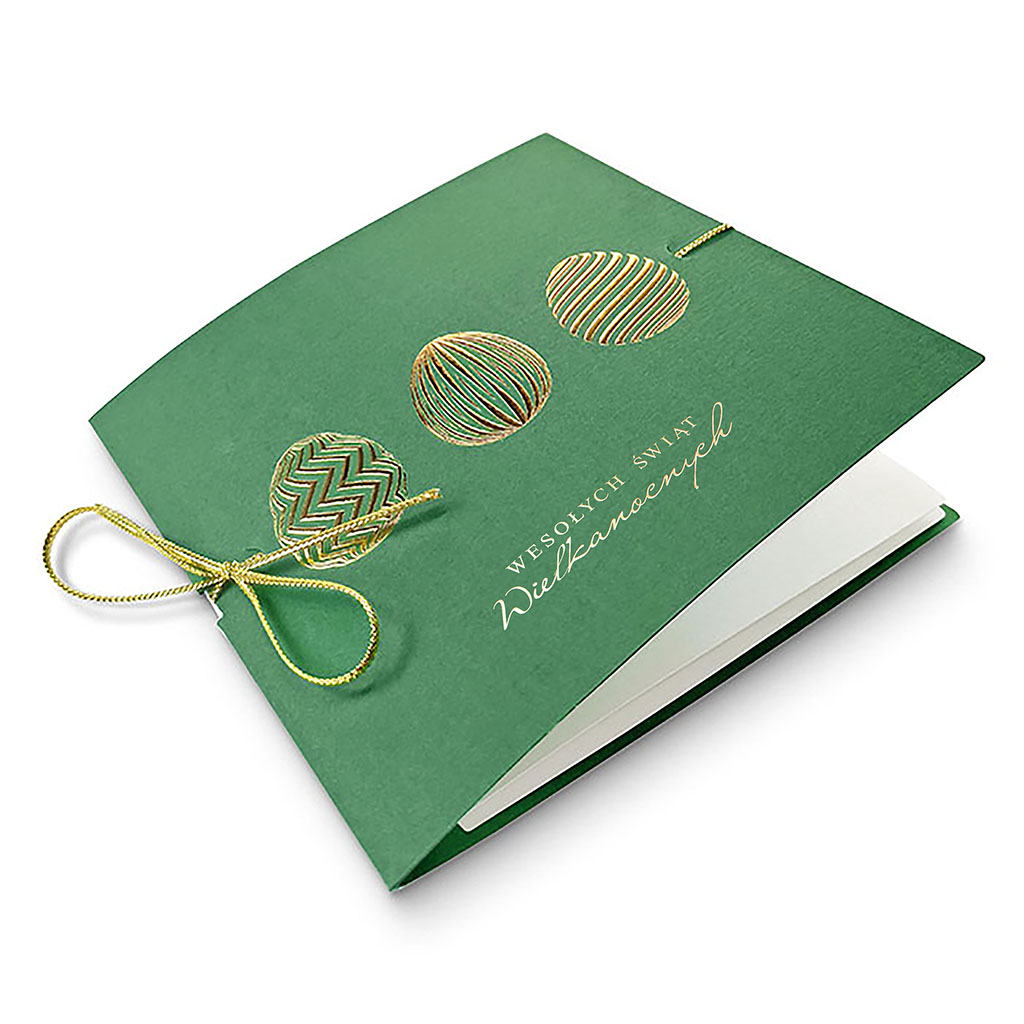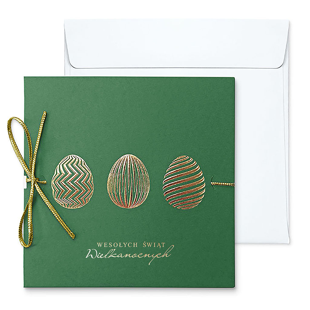 Elegancka kartka wielkanocna utrzymana w głębokiej, stonowanej zieleni z dekoracyjnym złoceniem. To propozycja dla osób ceniących spokojną estetykę, szlachetne kolory oraz staranne, prestiżowe wykończenie.