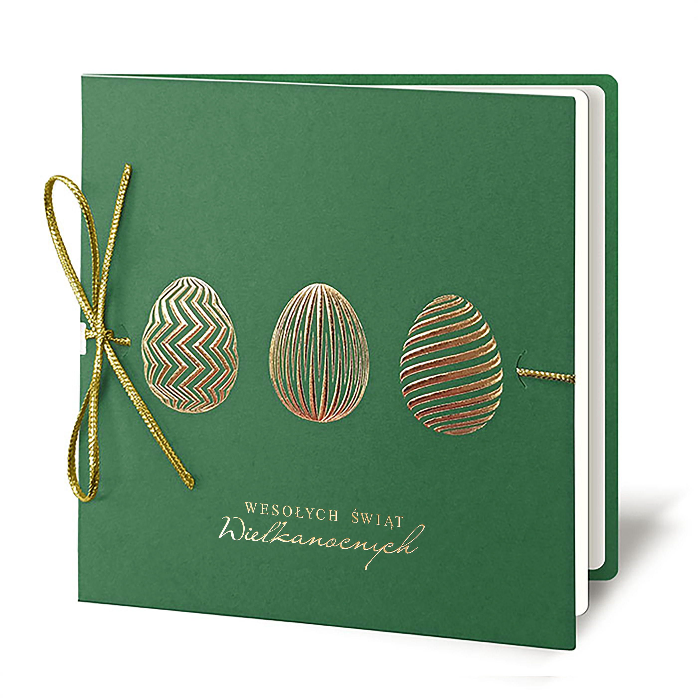 Całość dopełnia złocony napis "Wesołych Świąt Wielkanocnych", wykonany techniką hot print, nadający kartce wyjątkowo elegancki i reprezentacyjny charakter. Dodatkowym elementem dekoracyjnym jest złota wstążka przepleciona przez okładkę i zawiązana przy bigu, podkreślająca prezentowy styl kartki.