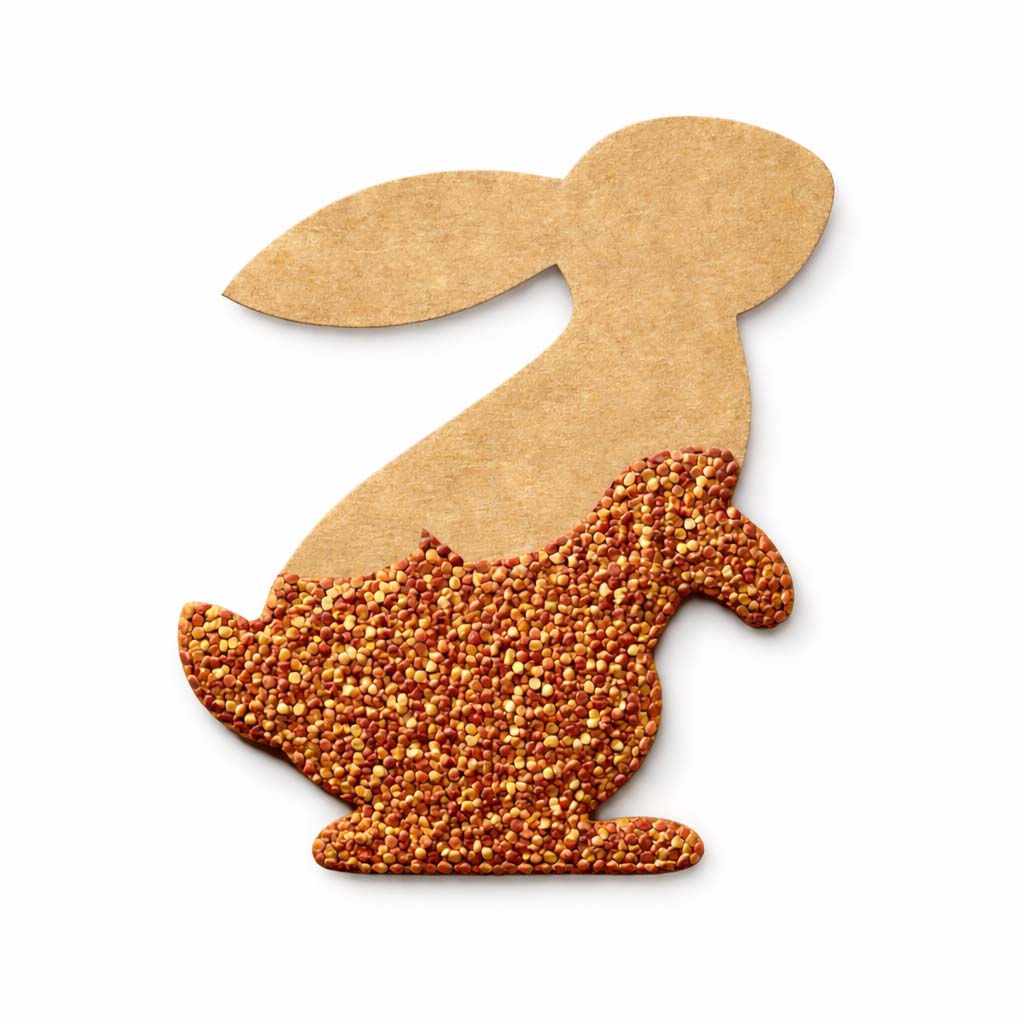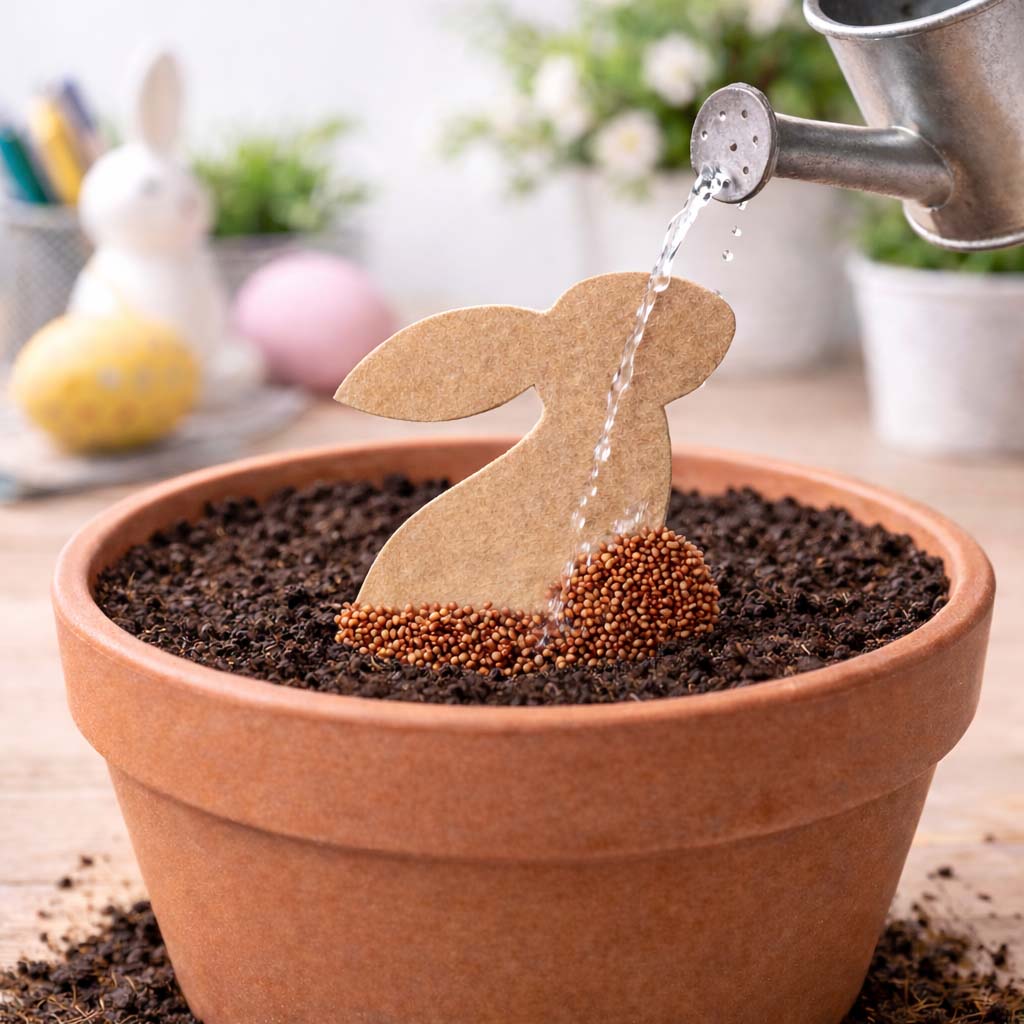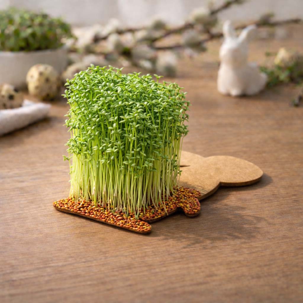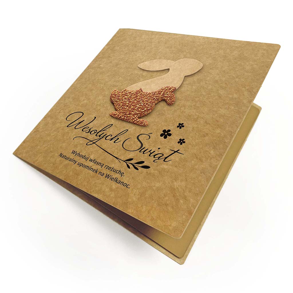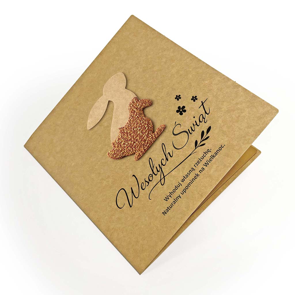 Kartka została wykonana z wysokiej jakości papieru ekologicznego o naturalnej strukturze i ciepłym odcieniu. Jej centralnym elementem jest aplikacja w kształcie zajączka, wykonana z ekologicznej tektury, wypełniona nasionami rzeżuchy. Po umieszczeniu na wilgotnym podłożu zamienia się w żywą, zieloną dekorację.