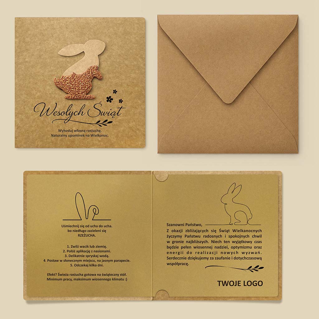 Projekt idealnie sprawdzi się jako oryginalny prezent wielkanocny dla klientów, partnerów biznesowych oraz jako wyjątkowa kartka prywatna dla osób ceniących ekologię, prostotę i autentyczność.
