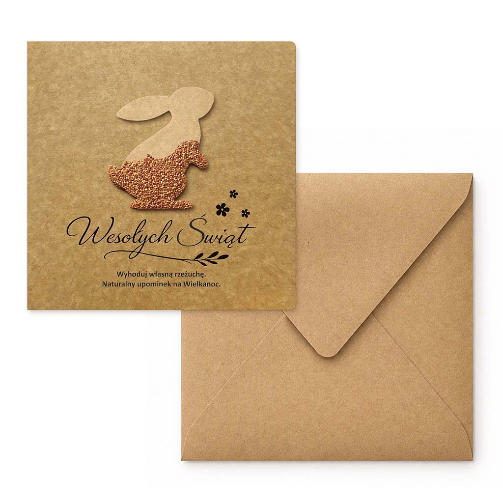 Wyjątkowa ekologiczna kartka wielkanocna, która łączy naturalną estetykę z funkcją interaktywnego upominku. Subtelna forma, kraftowa kolorystyka oraz aplikacja z nasionami rzeżuchy sprawiają, że kartka staje się nie tylko nośnikiem życzeń, ale także symbolicznym gestem odrodzenia, świeżości i wiosennej energii.