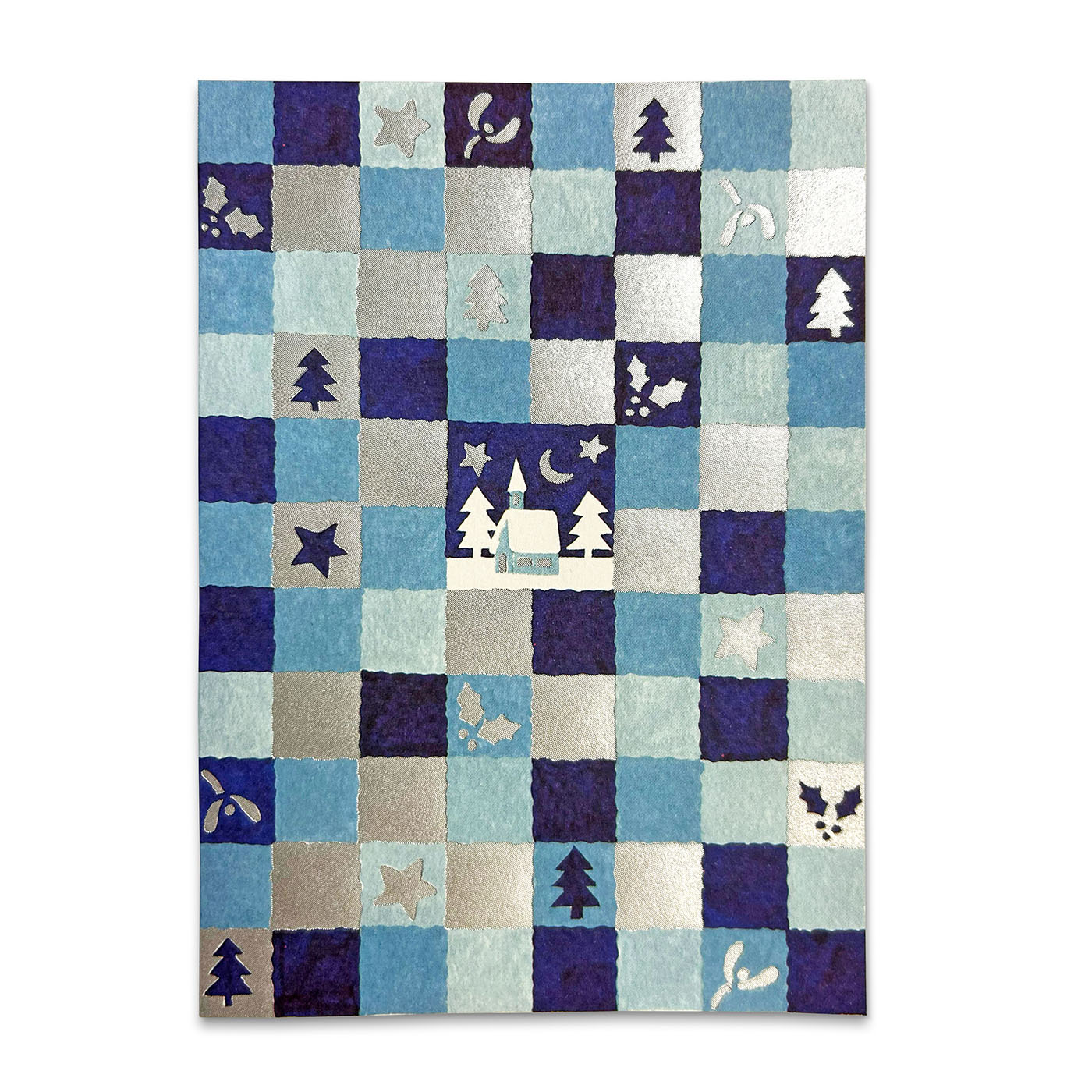 Nowoczesna kartka świąteczna, która łączy klasyczne symbole Bożego Narodzenia z geometrycznym data-stylem mozaiki. Ręcznie projektowany motyw na okładce składa się z efektownych kafelków w chłodnych odcieniach błękitu, srebra i granatu, zdobionych świątecznymi detalami takimi jak choinki, gwiazdki, ostrokrzew czy zimowa kapliczka. Całość została uszlachetniona eleganckim srebrzeniem, co dodaje głębi i szlachetnego blasku.