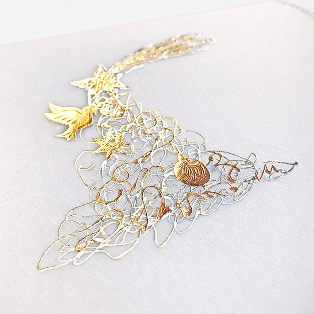 Elegancka i oryginalna kartka świąteczna wykonana z półprzezroczystej kalki, ozdobiona subtelnymi złoceniami i srebrzeniami. Delikatny, ażurowy motyw choinki z gwiazdkami, aniołkiem i bombką nadaje całości artystycznego charakteru. Wkładka wewnętrzna w kolorze matowej bieli stanowi idealne tło dla nadruku życzeń. Kartka zachwyca precyzją wykonania i starannością detali.
