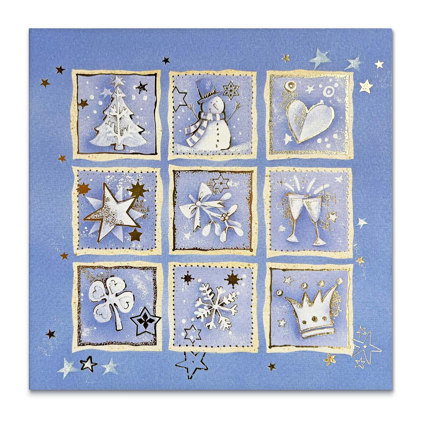 Pełna uroku i ciepła kartka świąteczna, która przenosi w bajkowy klimat zimowych świąt. Wykonana z wysokiej jakości matowego papieru z delikatną fakturą, zdobiona grafiką przedstawiającą dziewięć symboli świąt i nowego roku: choinkę, bałwanka, serce, gwiazdy, jemiołę, kieliszki, czterolistną koniczynkę, śnieżynkę i koronę. Każdy z elementów podkreślony jest subtelnym złoceniem, które dodaje kartce elegancji i blasku.