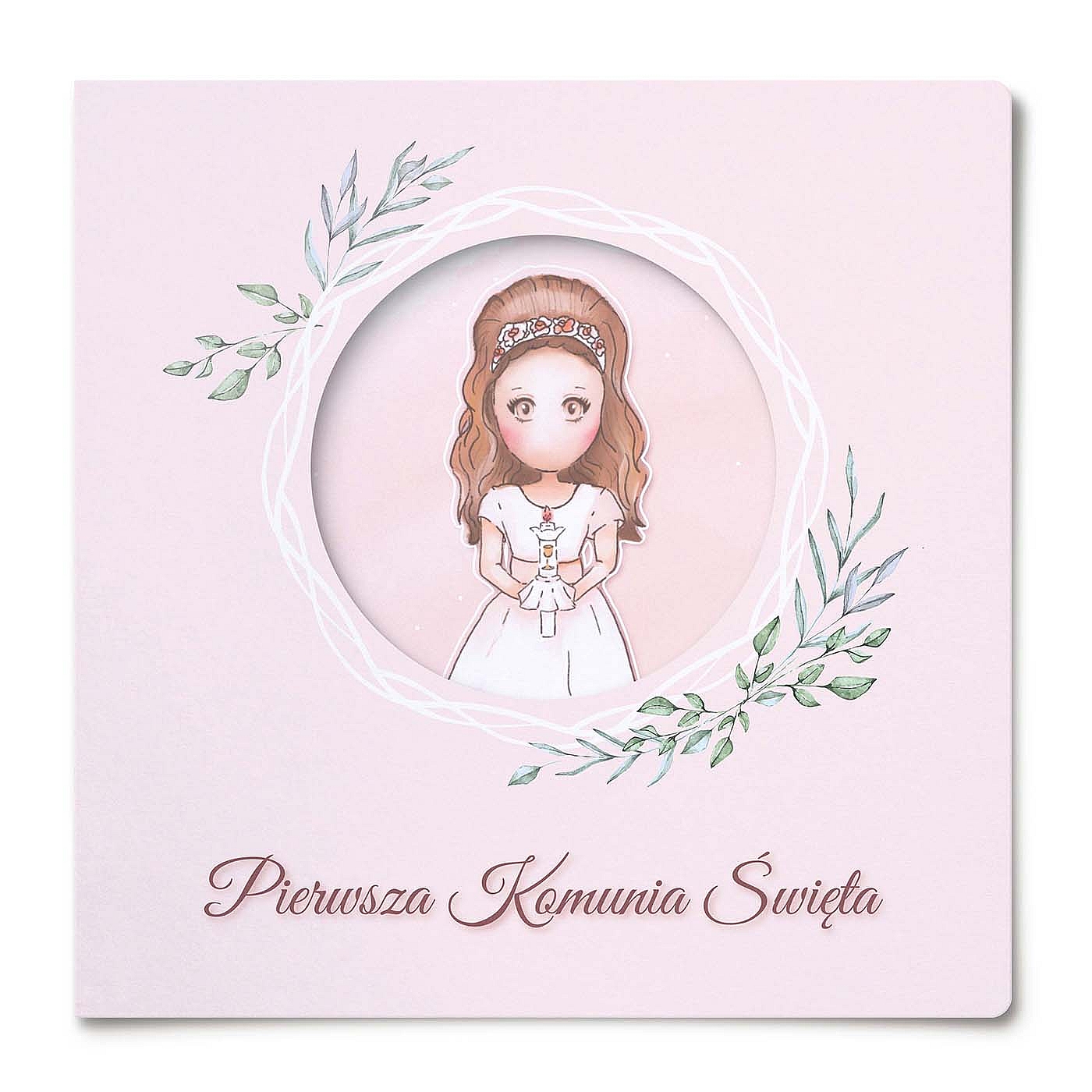 Zaproszenie składa się ze sztywnej okładki na której znajduje się otwór, przez który widoczna jest nadrukowana postać dziewczynki w stroju komunijnym, nadrukowana na pierwszej stronie białej matowej wkładki. Wkładka z tekstem do własnoręcznego wypisania.