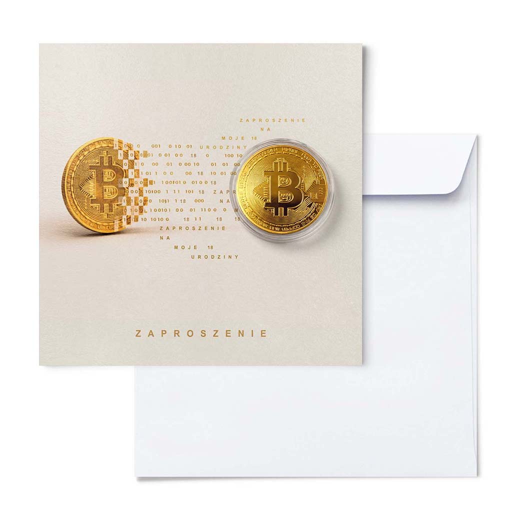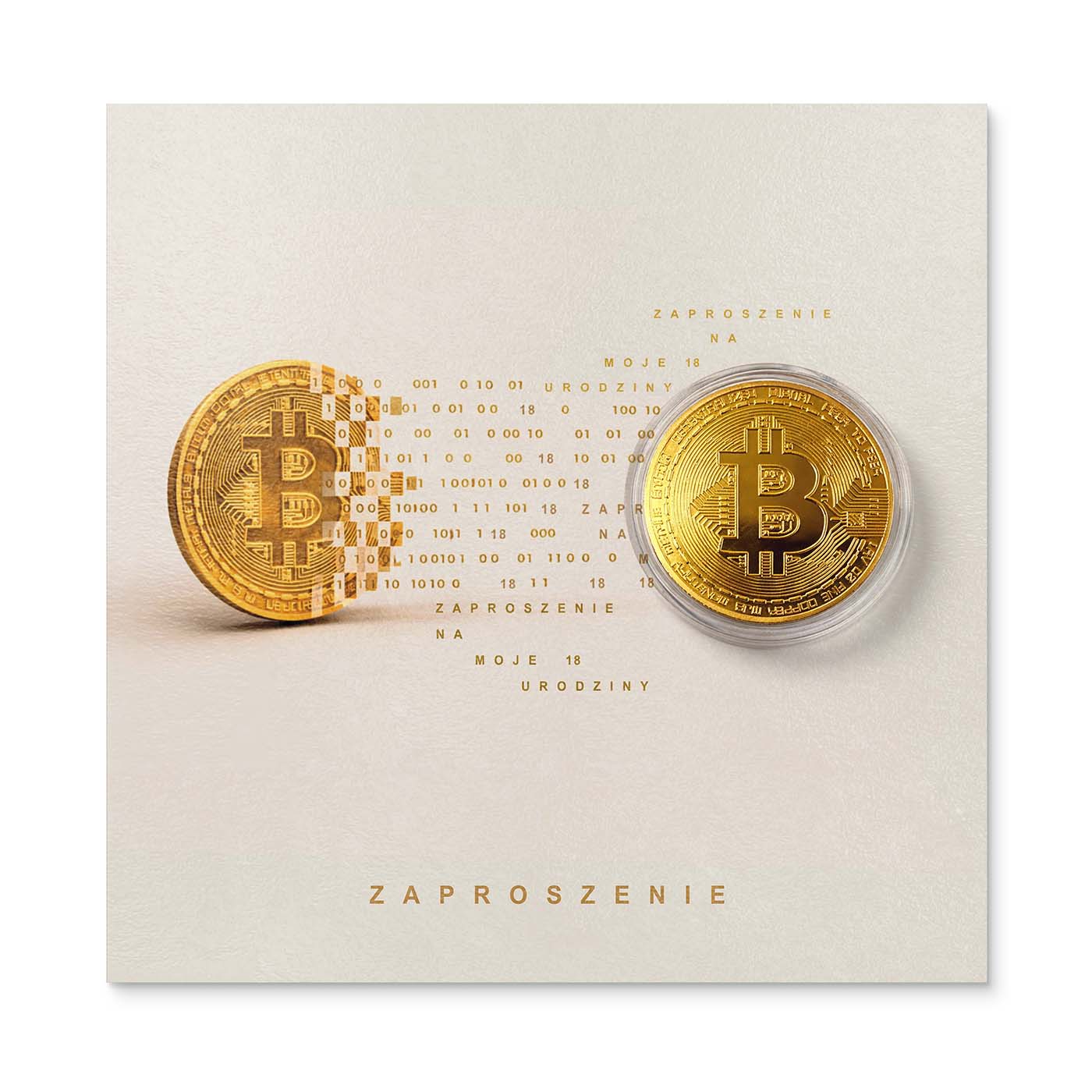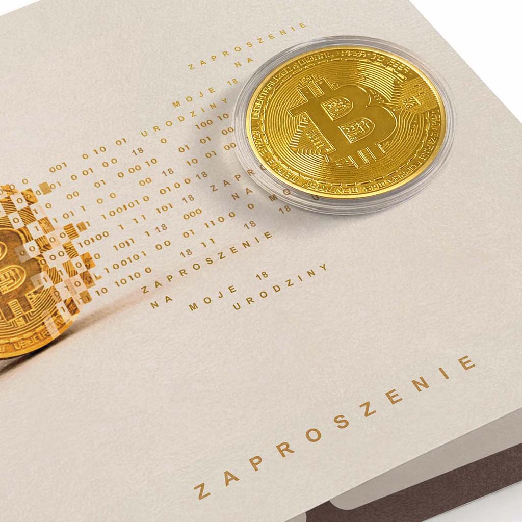 To propozycja dla osób, które cenią nowoczesność w eleganckim, stonowanym wydaniu. Zaproszenie na 18 urodziny z motywem Bitcoina w delikatnej kolorystyce łączy prestiż, minimalizm i modny akcent technologiczny.