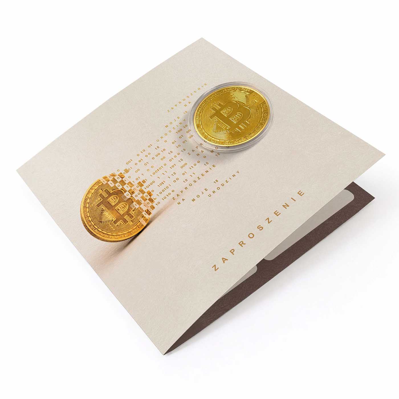 Front zaproszenia zdobi subtelna grafika złotego Bitcoina na jasnym, kremowym tle. Całość utrzymana jest w spokojnej, harmonijnej kolorystyce, która nadaje projektowi ponadczasowy charakter. Druk cyfrowy zapewnia wysoką jakość detali oraz eleganckie przejścia tonalne.