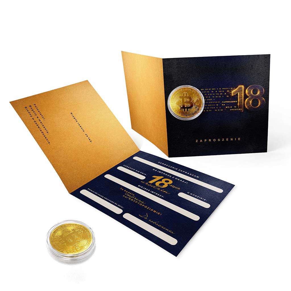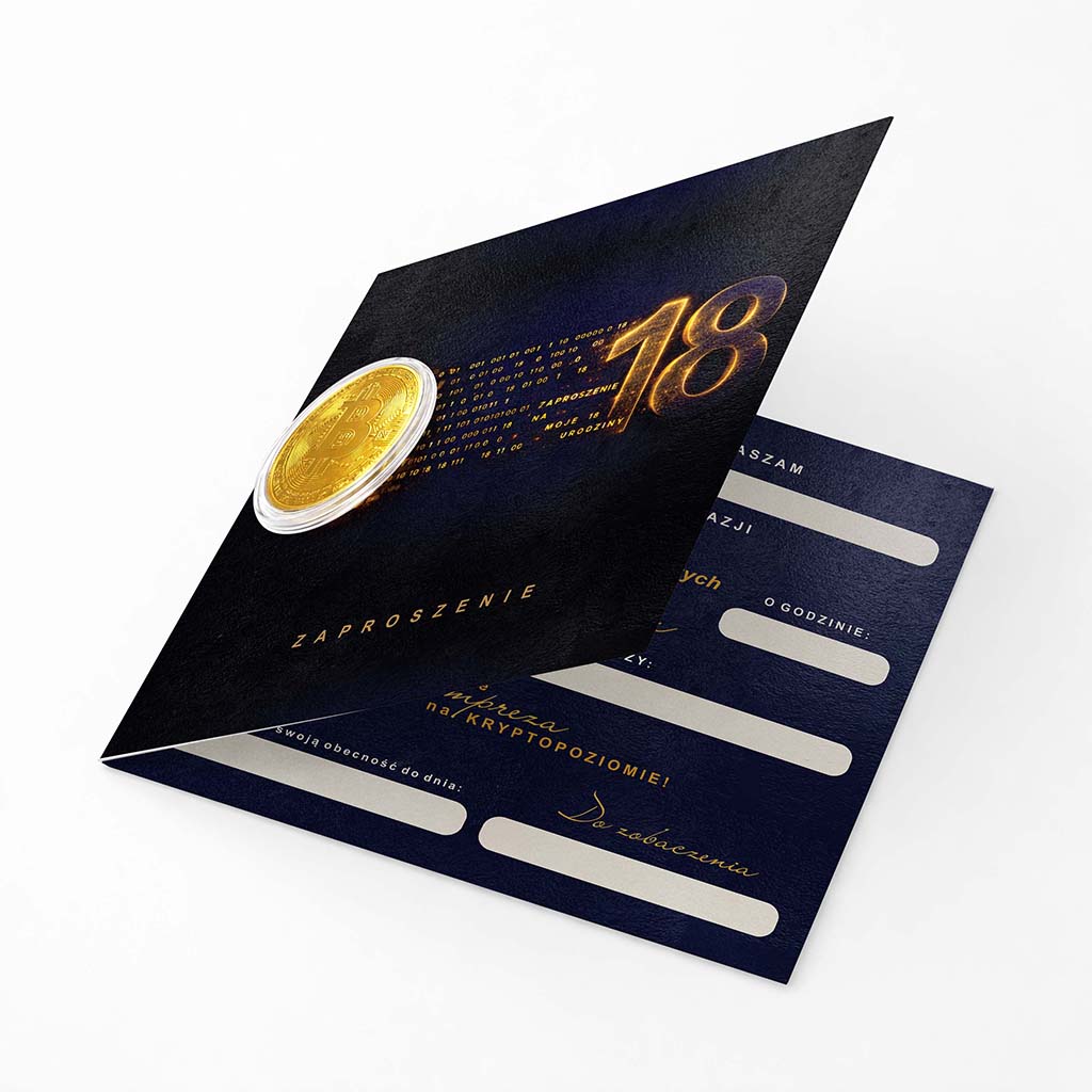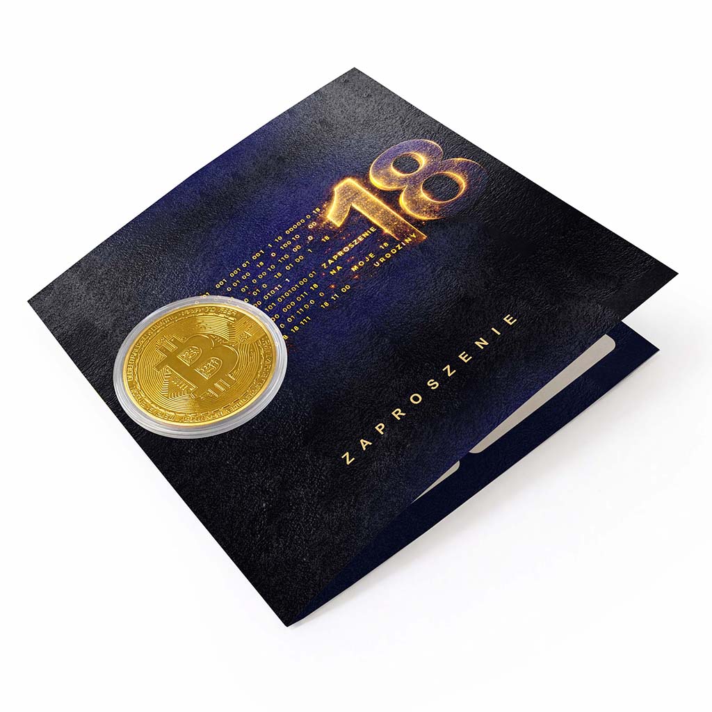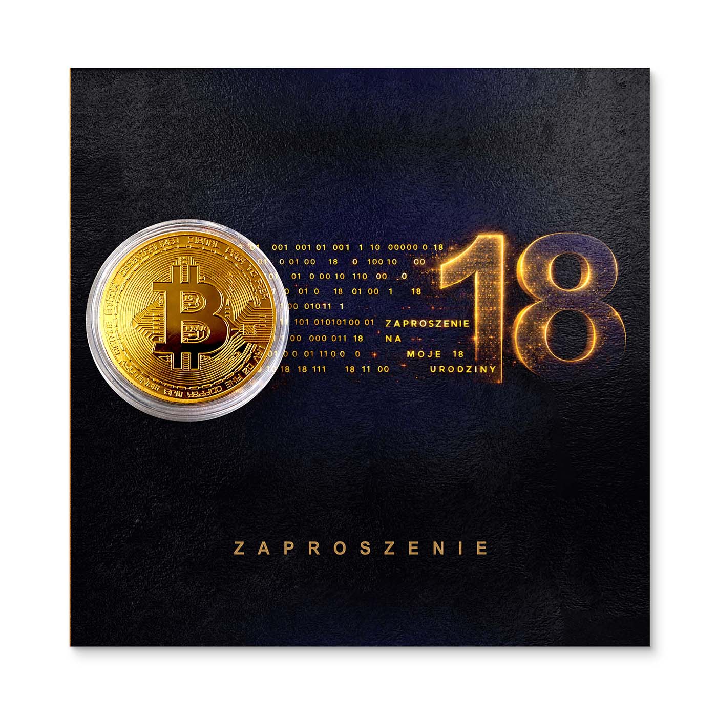 Front zaproszenia zdobi nadrukowana liczba "18" oraz dekoracyjny Bitcoin umieszczony w przezroczystym etui.