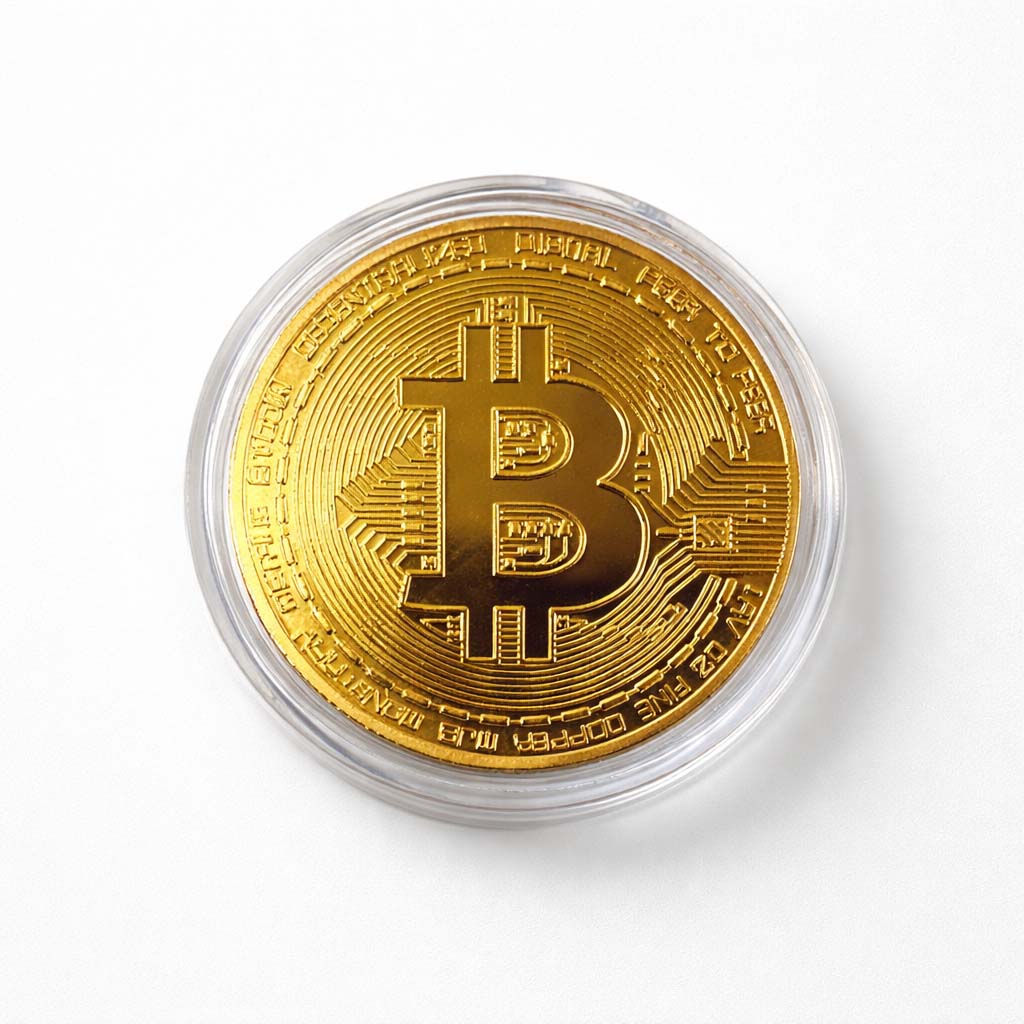 Gadżet: złoty Bitcoin w przezroczystym pudełeczku