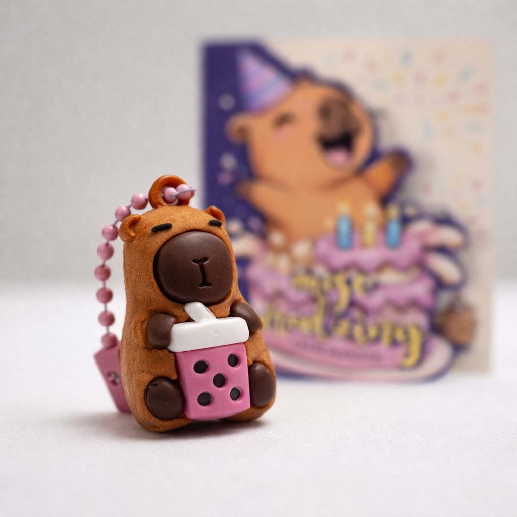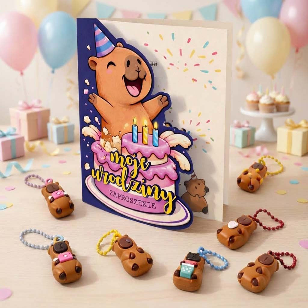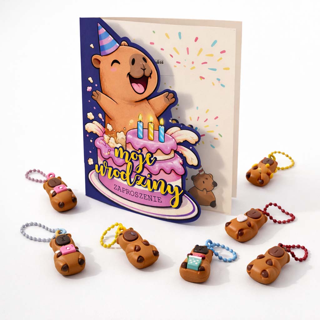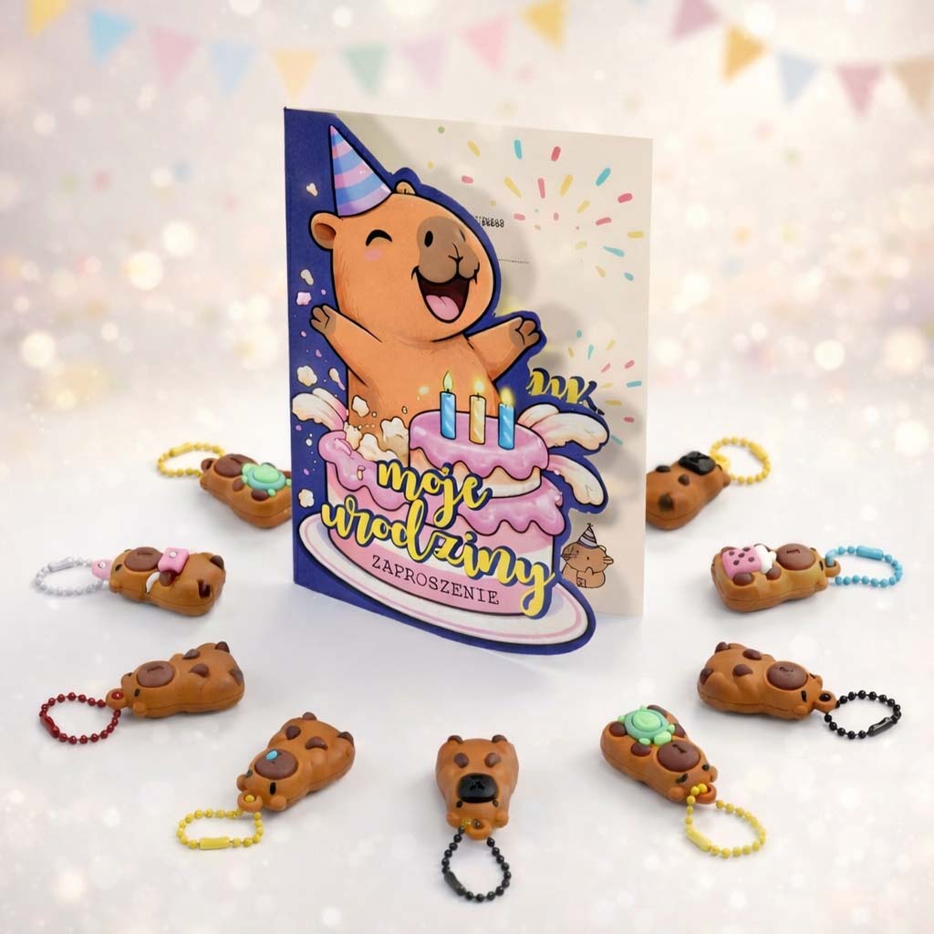 Każde zaproszenie wzbogacone jest o uroczy breloczek z kapibarą w losowym mixie kolorystycznym, który stanowi świetny gadżet i pamiątkę dla gościa. Mały detal, a robi wielką robotę - dzieci są zachwycone.