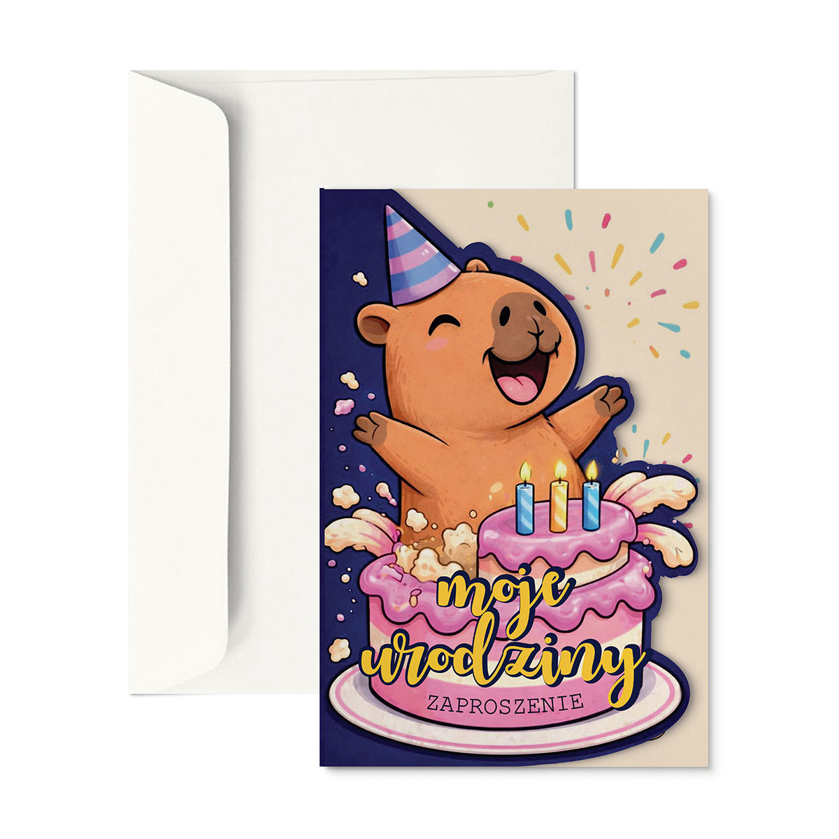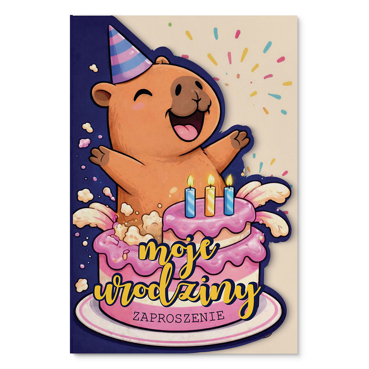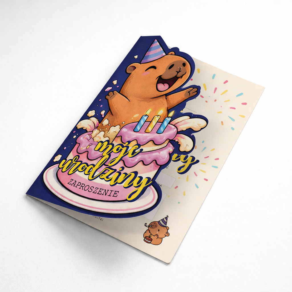 Radosne, pełne energii zaproszenie urodzinowe z kapibarą, która wyskakuje z tortu niczym gwiazda wieczoru. Są świeczki, jest konfetti, jest szeroki uśmiech - jednym słowem: imprezowy klimat od pierwszego spojrzenia.