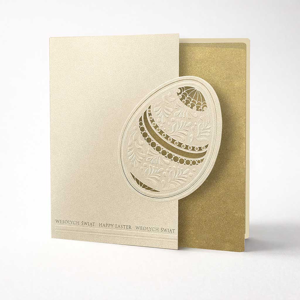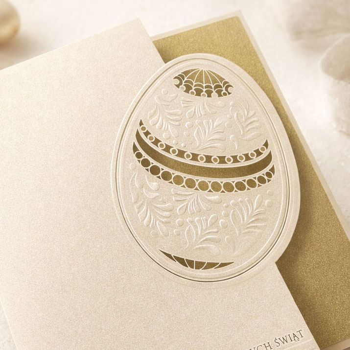 Okładka wykonana została z wysokiej jakości metalizowanego papieru w kolorze ecru, o subtelnym, perłowym połysku. Centralnym elementem kompozycji jest dekoracyjna pisanka, wykonana techniką precyzyjnego tłoczenia oraz cięcia laserowego, tworząca efekt przestrzennej, ażurowej struktury. Zastosowane uszlachetnienia nadają projektowi głębi i lekkości, a jednocześnie zachowują biznesowy umiar.